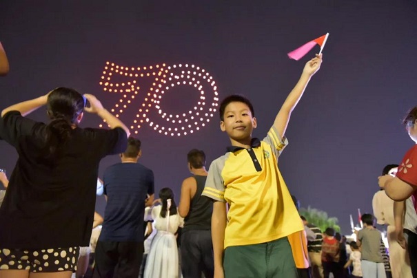 當空中的無人機擺出“I Love中國,I Love西塘”的造型時,西塘鎮(zhèn)中心小學(xué)六年級學(xué)生董誠就激動地跳了起來。“我是西塘人,我驕傲!祖國萬歲,我愛你!”董誠大聲喊道。