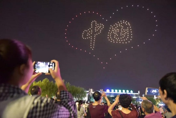 突然,人群中發(fā)出一聲驚呼:“來了,來了,你們快看,飛機來了!敝灰200架無人機組成的矩陣緩慢升空,開始變換造型。