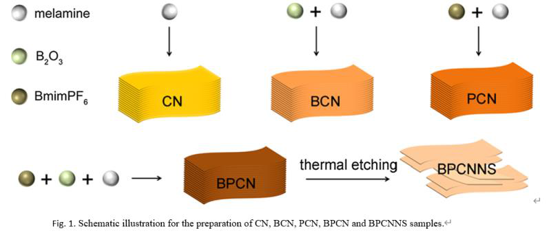 在此次研究中,張歡歡和她的團(tuán)隊(duì)在將硼元素(B)和磷元素(P)引入到氮化碳骨架的同時(shí),通過形貌調(diào)控改善石墨相氮化碳的光催化活性,成功制備出一種名為硼、磷共摻氮化碳超薄納米片(BPCNNS)光催化劑。這種光催化劑對(duì)水體中抗生素殘留的降解去除表現(xiàn)出高的活性和耐久性。