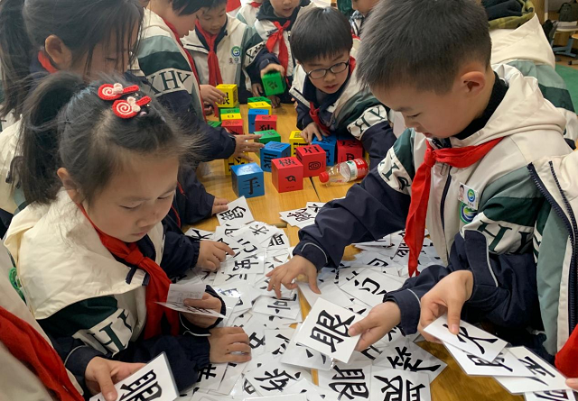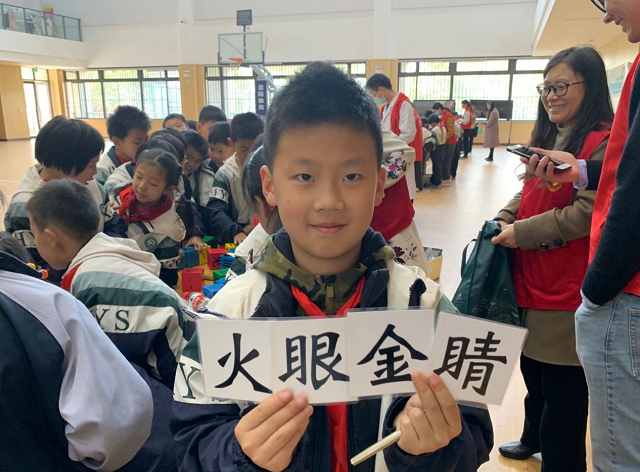 經(jīng)過“‘字’眼‘字’語”成語大比拼區(qū)域,一個小同學(xué)興奮的拉住記者說“老師,老師,我找齊‘火眼金睛’啦!”在這里,他認(rèn)真尋找?guī)А把邸弊值某烧Z,玩得不亦樂乎。