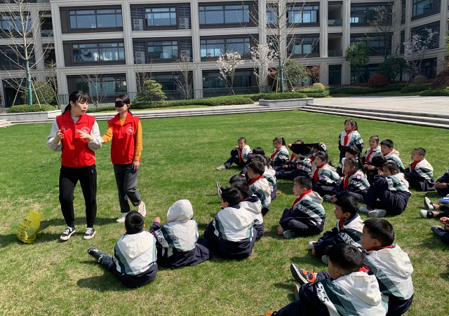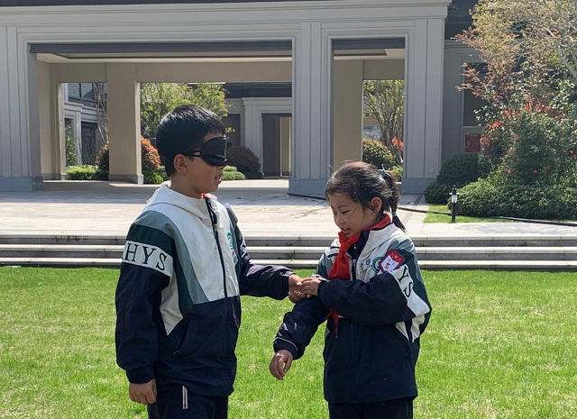 同時,現(xiàn)場還設(shè)置了“導(dǎo)盲隨行”體驗(yàn)環(huán)節(jié),同學(xué)們戴上黑色眼罩,兩人一組,開始體驗(yàn)盲人行走。一個小男孩戴上眼罩后,行走幾乎找不著北,在另一個小女孩的牽引下,終于完成了任務(wù)。他說“剛開始根本不知道往哪兒走,后來有人帶著我走,就好多了!蓖ㄟ^親身體驗(yàn)盲人朋友的不便,充分認(rèn)識到愛護(hù)眼睛健康的重要性。