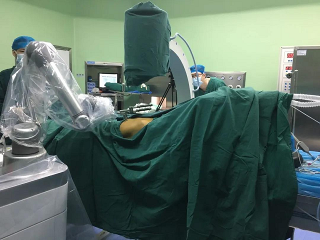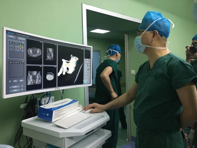 那么,骨科機(jī)器人是如何做手術(shù)的呢?和普通醫(yī)生一樣,它也要披上“手術(shù)服”,在經(jīng)過(guò)嚴(yán)格消毒的環(huán)境中,與醫(yī)生共同“戰(zhàn)斗”。醫(yī)生介紹,骨科手術(shù)機(jī)器人輔助手術(shù)簡(jiǎn)單描述可分為三步:首先骨科醫(yī)生對(duì)病人進(jìn)行術(shù)前檢查,將CT影像學(xué)資料調(diào)取后輸入機(jī)器人的電腦系統(tǒng)中,然后在電腦中對(duì)手術(shù)計(jì)劃進(jìn)行詳細(xì)的數(shù)字化三維規(guī)劃;然后術(shù)前用骨科手術(shù)C臂機(jī)對(duì)病人進(jìn)行透視,將二維或三維影像資料也上傳至機(jī)器人電腦,并將兩套影像資料進(jìn)行融合;最后根據(jù)程序準(zhǔn)確定位手術(shù)路徑,機(jī)器人通過(guò)機(jī)械臂的精確運(yùn)動(dòng),為醫(yī)生提供穩(wěn)定的導(dǎo)針置入路徑,使醫(yī)生可以按照預(yù)期的規(guī)劃,準(zhǔn)確地置入螺釘,從而完成手術(shù)。