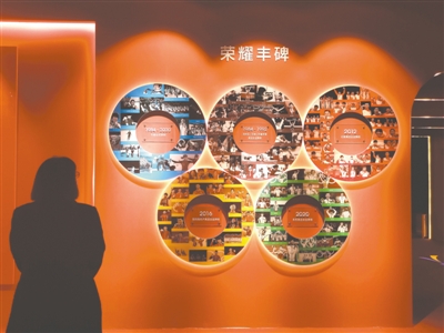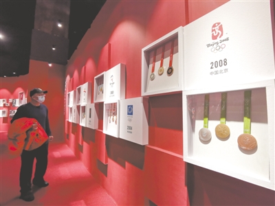 圖為觀眾觀看奧運(yùn)元素展品。