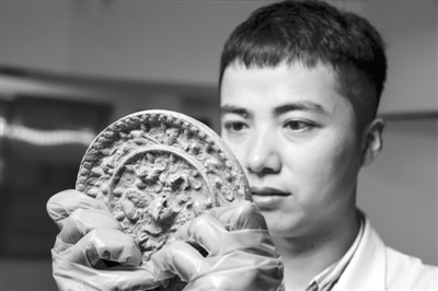 圖為5月18日,“文物醫(yī)生”騰昭玉在檢查文物“唐海獸葡萄鏡”。