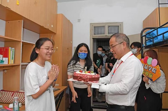 “大學報到第一天,剛好趕上自己過生日,第一次離開父母過生日還真不習慣,也不知道該準備什么。光顧著準備開學的東西,都忘了生日可以吃蛋糕!笔称放c生物工程學院新生明靜來自海寧,收到蛋糕的時候非常激動,“學校居然記得我的生日,書記還給我題字,開啟我大學生活的序幕,這太讓我驚喜了!”