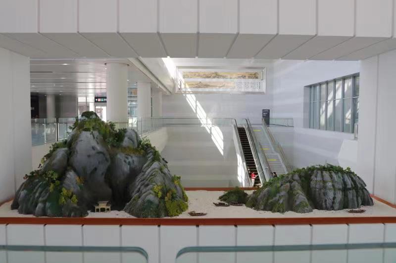 在換乘廳東側(cè)鏤空區(qū)域則設(shè)有“枯山水盆景”,此處采用一段類似以《富春山居圖》實景地的桐廬山水,與對面的《富春山居圖》選段遙相呼應(yīng)、互為補(bǔ)充。