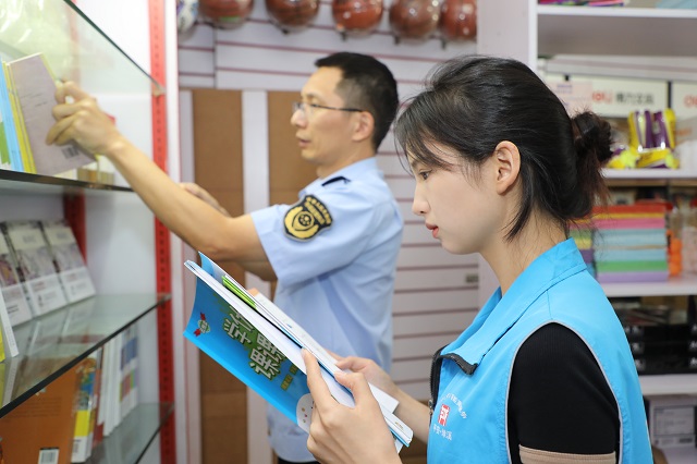 9月23日,吳興區(qū)埭溪鎮(zhèn)市場監(jiān)管所工作人員、網(wǎng)格員在轄區(qū)一家書店對書籍、進貨票據(jù)等進行檢查。