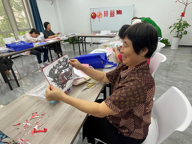 在中泰街道新明社區(qū)黨群服務(wù)中心,婦女同胞正在創(chuàng)作色彩豐富、形態(tài)各異的剪紙作品;顒訉⒅腥A傳統(tǒng)文化與時代精神進行了完美結(jié)合,進一步激發(fā)了婦女群眾的家國情懷,傳遞了愛祖國愛家園、樹新風(fēng)樹正氣的正能量。