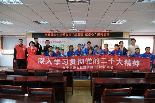 3月14日,紅十三愛心社志愿者到永嘉縣下塘小學(xué)進(jìn)行黨的二十大精神宣講,為孩子們送上零食大禮包和獎(jiǎng)學(xué)金。