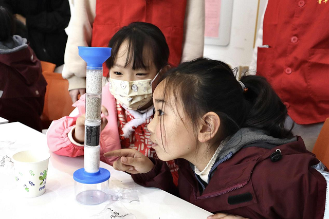 日前,杭州市錢塘區(qū)白楊街道云濱社區(qū)的活動室里,孩子們秉著呼吸聆聽著水滴落的聲音,渾濁的污水經(jīng)過凈水器層層過濾后變成清澈的水滴落在收集器里,孩子們瞬間爆發(fā)出陣陣的歡呼聲。