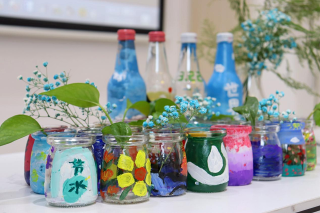當孩子們用凈化出來的水倒到水培的容器里,放入綠蘿。
