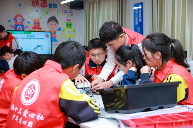 溫州電力紅十三志愿者為學(xué)校升級(jí)改造計(jì)算機(jī)教室,打造“創(chuàng)想課堂”,更新學(xué)校30臺(tái)計(jì)算機(jī),引入移動(dòng)式教學(xué)一體機(jī)和STEAM課程!皠(chuàng)想課堂”的打造,搭建了東西教育資源共享平臺(tái),構(gòu)建新型學(xué)習(xí)共同體,共同反思、促進(jìn)、成長,形成常態(tài)化的反饋交流!笆T初中地處偏遠(yuǎn),教育設(shè)備設(shè)施較為落后,這影響了石門教育事業(yè)的發(fā)展!标兾魇⊙柺惺T初級(jí)中學(xué)校長黎明智表示。志愿者李程遠(yuǎn)利用一體機(jī)和STEAM教具為學(xué)校學(xué)生開展課程教學(xué),從STEAM課程介紹,到機(jī)器人小車組裝、傳感器安裝、圖形化編程,最終實(shí)現(xiàn)機(jī)器人小車在黑線軌道巡線!皠(chuàng)想課堂”像一個(gè)“魔法課堂”,為學(xué)生打開一扇新的大門,讓夢想的光芒照進(jìn)大山深處!暗谝粋(gè)機(jī)器人動(dòng)起來的時(shí)候,我感到非常自豪。”九年一班學(xué)生周以鑫說。志愿者們還為學(xué)生們演示了無人機(jī)操作流程,教他們?nèi)绾尾僮鳠o人機(jī),讓學(xué)生的夢想與無人機(jī)一起飛翔。