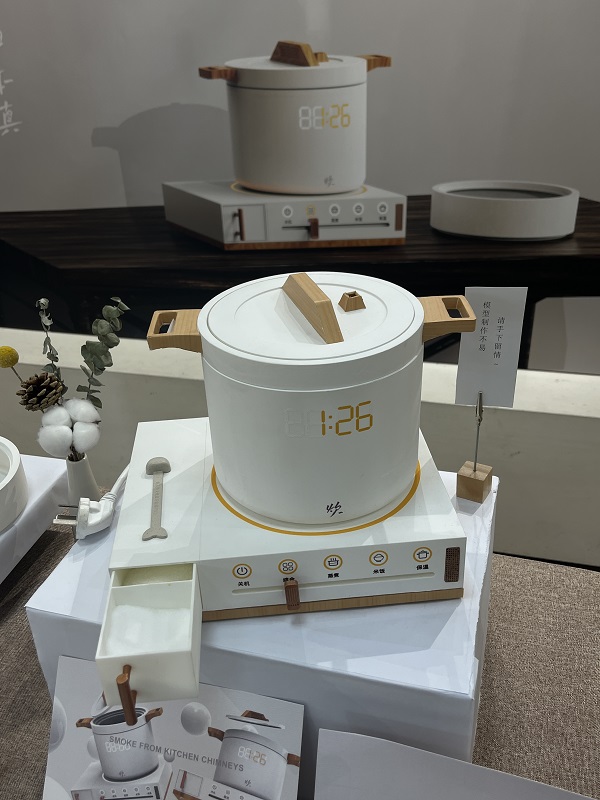 一個(gè)“老式鍋”電飯鍋吸引了不少師生,這是數(shù)字化適老產(chǎn)品設(shè)計(jì)項(xiàng)目“炊”。作者江欣怡在調(diào)研過程中發(fā)現(xiàn)獨(dú)居老人在生活中往往會(huì)有“一頓菜吃一天”的現(xiàn)象,非常不利于老年群體的營(yíng)養(yǎng)均衡,尤其是“三高”老年人群。而在情感方面,獨(dú)居老人又希望能夠與子女們有更多的互動(dòng)交流。