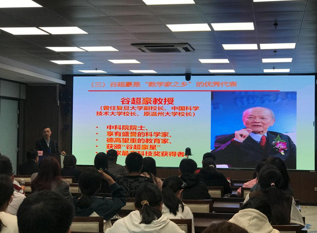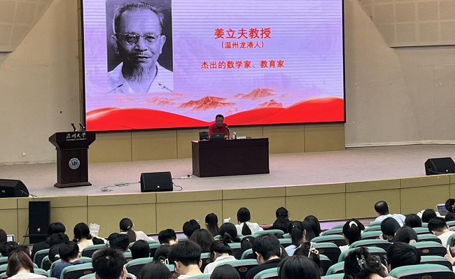 “姜立夫先生是中國現(xiàn)代數(shù)學(xué)的奠基人,早年他在美國加州大學(xué)學(xué)習(xí)時(shí),就立志要把現(xiàn)代數(shù)學(xué)移植到中國來,他的一生對(duì)中國數(shù)學(xué)作出了巨大貢獻(xiàn)……”5月29日晚,在一場(chǎng)主題為弘揚(yáng)科學(xué)家精神的專題講座上,溫州大學(xué)數(shù)學(xué)系主任郭洪欣教授如數(shù)家珍般介紹姜立夫先生的故事,向溫大學(xué)子傳播科學(xué)的種子。