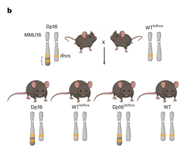唐氏綜合征是一種遺傳病,患者所有細(xì)胞的21號(hào)染色體都有3個(gè)拷貝,而不是正常的兩個(gè)拷貝。21號(hào)染色體內(nèi)有一組免疫相關(guān)基因,也稱IFNR基因簇。然而,21號(hào)染色體的這個(gè)多余拷貝如何導(dǎo)致了這種疾病仍然不明確。之前曾利用小鼠研究過這種疾病,因?yàn)榕c人類21號(hào)染色體對(duì)應(yīng)的基因組區(qū)域有一個(gè)多余拷貝的小鼠也表現(xiàn)出人類唐氏綜合征患者的許多特征。