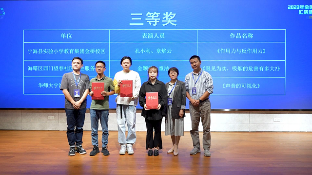 同屬寧海縣實驗小學(xué)教育集團金橋校區(qū)的孔小利、章焰云代表隊作品《作用力與反作用力》,海曙區(qū)西門街道望春社區(qū)衛(wèi)生服務(wù)中心金穎瑩、童潔代表隊作品《眼見為實,吸煙的危害有多大?》,華師大寧波藝術(shù)實驗學(xué)校王雄杰代表隊作品《聲音的可視化》榮獲三等獎。