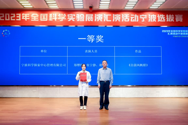 經(jīng)過一天扣人心弦的激烈比拚,最后,寧波科學(xué)探索中心管理有限公司鄭繆璇、張寧靜、胡馨悅代表隊作品《自鼓風(fēng)帆船》力壓群雄,以95.33分的三年以來全場最高分拔得頭籌,榮獲2023年全國科學(xué)實驗展演匯演活動寧波選拔賽第一名,榮膺一等獎。