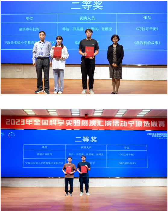 慈溪市科技館韓潔、鄭昊藩、陳思琪、張櫻瑩代表隊作品《巧技尋平衡》以95.00的全場第二高分?jǐn)?shù)獲得第二名,榮獲二等獎;寧海縣實驗小學(xué)教育集團金橋校區(qū)章晨陽、陳軒宇代表隊作品《蒸汽機的故事》獲得93.33的全場第三高分,名列第三名,分別獲得二等獎。
