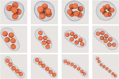 研究人員表示,對于多達9個球體,實驗和模擬都證明了香腸形狀是最好的包裝形狀。當超過9個球時,膜會因球的壓力而變形。但是當有56個到70個球時,包裝效率又突然變得高效。這些發(fā)現(xiàn)可能在藥物輸送方面有所應(yīng)用,例如如何最有效地將硬質(zhì)抗生素分子裝在細胞膜內(nèi)。(記者 張佳欣)