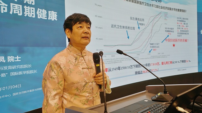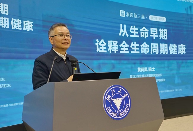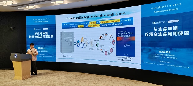 中國科學(xué)院院士、復(fù)旦大學(xué)生殖與發(fā)育研究院院長、浙江大學(xué)“一帶一路”國際醫(yī)學(xué)院院長黃荷鳳作了《從生命早期詮釋全生命周期健康》科普報告。杭州市西湖區(qū)三墩鎮(zhèn)水秀苑社區(qū)黨總支書記梁小平組織社區(qū)居民走進浙江大學(xué)紫金港校區(qū)智云報告廳,面對面聆聽黃院士講課。