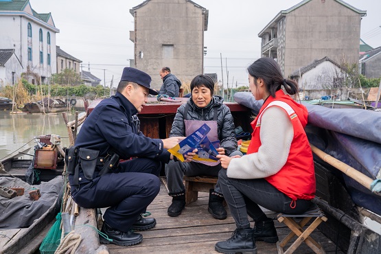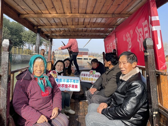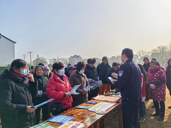 在三紅村網(wǎng)船文化公園,派出所民警朱黎通過面對(duì)面講解、發(fā)放普法資料等形式,為在場的村民們,特別是老年群眾,講解常見養(yǎng)老詐騙典型案例及防范技巧,提醒老人注意保護(hù)好個(gè)人隱私,莫要貪圖小利,有事多和子女商量,必要時(shí)及時(shí)撥打110求助,切實(shí)守護(hù)好自己的“養(yǎng)老錢”。