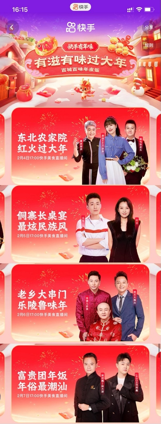 百城百味年夜飯,有滋有味過大年,2月4日至2月7日,快手將鏡頭推向老百姓的新年餐桌,與明星何潔,國宴名廚@夏叔廚房、@馮偉Nemo、@爺倆兒好菜高炳義師徒、@林述巍,以及快手創(chuàng)作者@房琪kiki不放棄、@咱屯張老五、@武文大舞臺、@JASON劉雨鑫,走進東北四平、貴州侗寨、山東樂陵、廣州潮汕四地,大秀廚藝解鎖普通人的年夜飯新菜單。在一道道美食烹制的過程中,不僅還原了當?shù)靥厣L味,更抒發(fā)了大家對團圓的滿足與期待。