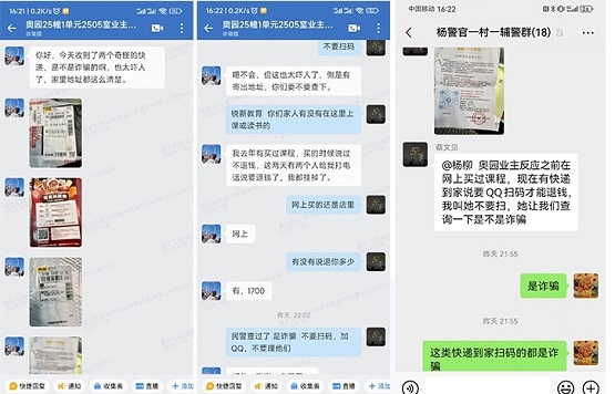 “你好,今天收到兩個奇怪的快遞,是不是詐騙的。恳蔡珖樔肆,家里地址都這么清楚!1月18日16時22分,杭州市蕭山區(qū)蜀山派出所駐村輔警在企業(yè)微信上收到北辰奧園租戶的詢問,疑似有被騙風險。駐村輔警了解情況后立即告知該業(yè)主不要繼續(xù)進行操作,同時與社區(qū)民警確認是詐騙后,第一時間上門拆除該“詐彈”。