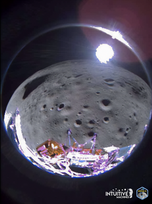 “奧德修斯”于美國東部時(shí)間2月22日著陸月球南極附近,實(shí)際著陸點(diǎn)距離預(yù)定的Malapert A著陸點(diǎn)有1.5公里。這是美國自1972年阿波羅17號(hào)登月以來第一個(gè)在月球表面軟著陸的航天器,也是私營企業(yè)首次登陸月表。起初,直覺機(jī)器公司稱“奧德修斯”是直立的并開始發(fā)送數(shù)據(jù),但后來透露著陸器在著陸過程中的速度比計(jì)劃的要快,最終側(cè)翻,躺在月球上。