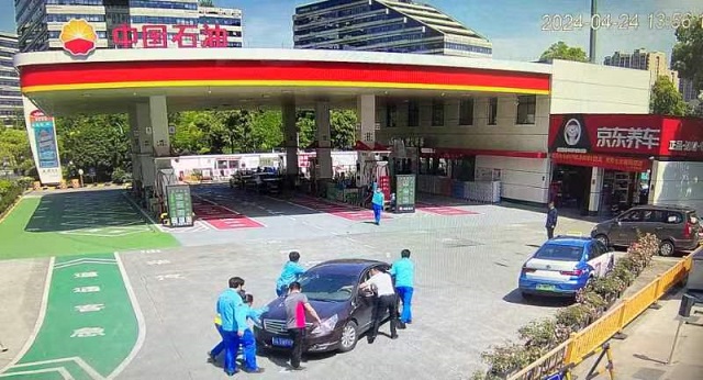 當(dāng)天下午14時左右,一位穿著時髦的女士匆忙走進(jìn)了紅普路加油站,“我的車沒油了,能買點汽油嗎?”“不好意思,女士,按照公安機(jī)關(guān)的相關(guān)規(guī)定,您這屬于購買散裝汽油。我們加油站是不能加散裝汽油的!闭诂F(xiàn)場忙碌的站經(jīng)理徐曉宇耐心地向她解釋緣由!澳窃趺崔k?我的車一點都沒有油了,停在路中間,開不了了!迸康穆曇衾锍錆M了焦急與無助。徐曉宇瞬間明白了女士要購買散裝汽油的緣由。恰巧杭州分公司機(jī)關(guān)幫扶人員張英浩等人到達(dá)了加油站!澳能囋谀模俊薄熬驮趯γ骜R路,離你們加油站大概一兩百米!薄白撸覀?nèi)湍七^來加油。”張英浩二話不說,帶著兩名加油站員工推回了“趴窩”的車子。