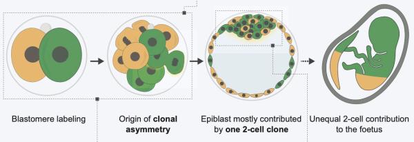 在這項研究中,研究者們通過譜系追蹤技術(lineage tracing)來標記和追蹤早期的胚胎細胞,發(fā)現(xiàn)受精卵分裂之初所形成的兩個細胞已經具有不同的命運——其中一個及其后代會形成內細胞團(Inner Cell Mass,ICM)并最終發(fā)育成胎兒,而另一個則會形成滋養(yǎng)外胚層(Trophectoderm, TE),最終發(fā)展成胎盤和一些胚胎外組織。