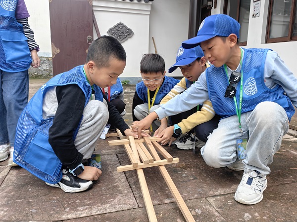 學完相關知識后,孩子對接下來的“搭建魯班橋”環(huán)節(jié)充滿期待。不費一滴膠,不用一顆釘,只用幾根木頭就能搭建出一座橋。孩子們帶著好奇心,幾人一組,相互配合。“我們搭出來啦!”一些小朋友在經(jīng)過老師的簡單指點后,成功搭建出“魯班橋”,興奮地向大家展示成果。隨后,老師一邊為大家進行專業(yè)示范,一邊講解相關知識,帶領大家深度學習中國古建的內部結構、力學原理,科學探索榫卯結構的奧秘。