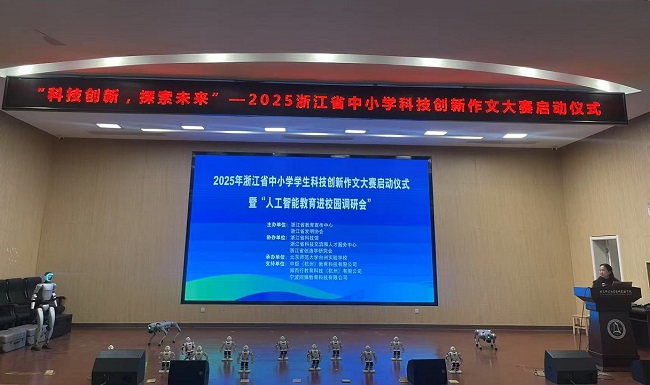 動(dòng),倡導(dǎo)中小學(xué)生探索未來(lái)、永保好奇心。省科技廳科技人才與科普處顧秋陽(yáng)指出今天舉辦的2025年浙江省中小學(xué)學(xué)生科技創(chuàng)新作文大賽啟動(dòng)儀式暨“人工智能教育進(jìn)校園調(diào)研會(huì)”意義非凡。新修訂《科普法》指出,中小學(xué)校、特殊教育學(xué)校應(yīng)當(dāng)利用校內(nèi)、校外資源,提高科學(xué)教育質(zhì)量,完善科學(xué)教育課程和實(shí)踐活動(dòng),激發(fā)學(xué)生對(duì)科學(xué)的興趣,培養(yǎng)科學(xué)思維、創(chuàng)新意識(shí)和創(chuàng)新能力。省科技廳堅(jiān)持在“雙減”工作中做好科學(xué)教育加法,積極開(kāi)展科技資源科普化托舉青年科技人才等試點(diǎn)工作,協(xié)同推進(jìn)“千名科學(xué)家進(jìn)校園播種”行動(dòng),組織科學(xué)家擔(dān)任科學(xué)副校長(zhǎng),開(kāi)展科學(xué)精神教育和科學(xué)家故事創(chuàng)作等活動(dòng),取得了一系列成效。此次以“科技創(chuàng)新探索未來(lái)”為主題舉辦中小學(xué)學(xué)生科技創(chuàng)新作文大賽,從“我心中的科技館”、“心動(dòng)的科普內(nèi)容”等角度提升青少年的科技創(chuàng)新素養(yǎng)和人文素養(yǎng),具有重要價(jià)值。