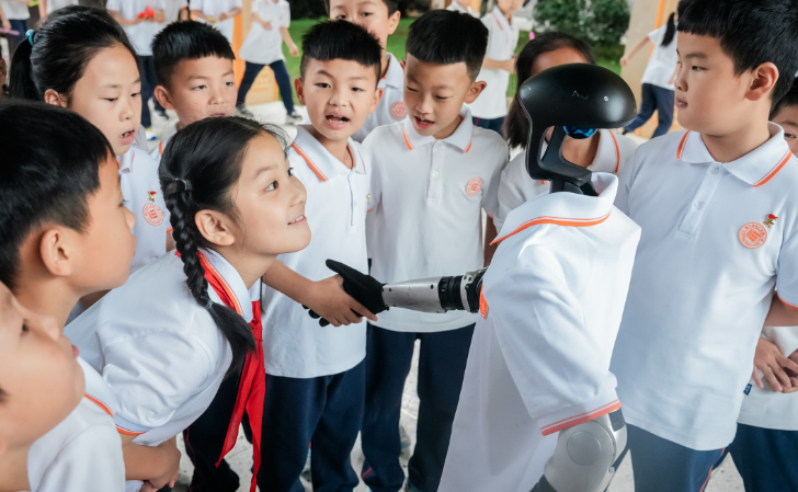 最燃時(shí)刻當(dāng)屬宇樹機(jī)器人登場(chǎng)!這個(gè)靈活的“鋼鐵明星”剛亮相就主動(dòng)揮手“打招呼”,引得全場(chǎng)驚呼。當(dāng)幾位幸運(yùn)同學(xué)受邀上臺(tái),機(jī)器人緩緩伸出機(jī)械臂與孩子們“握手”,指尖觸碰的瞬間,科技不再冰冷——有孩子興奮地說:“感覺像在和電影里的智能伙伴交朋友!”