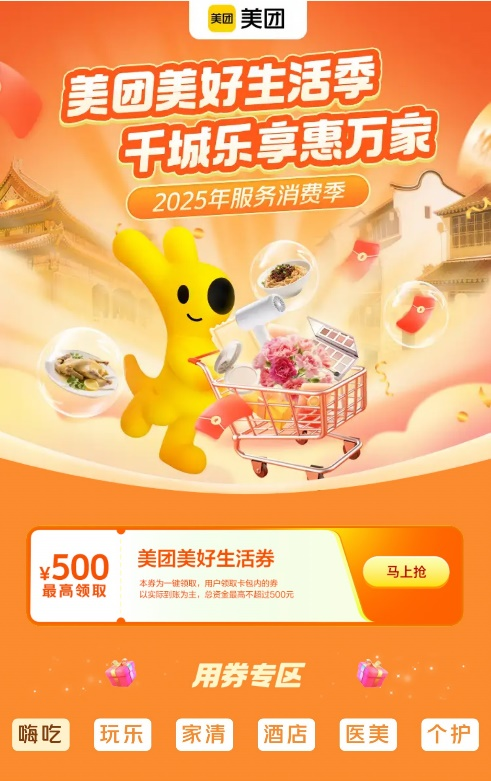 美團(tuán)相關(guān)負(fù)責(zé)人表示,作為服務(wù)零售平臺(tái)的代表,美團(tuán)將充分發(fā)揮“線上+線下”的數(shù)字化能力,以數(shù)字創(chuàng)新助力服務(wù)消費(fèi)高質(zhì)量發(fā)展。據(jù)了解,美團(tuán)美好生活季·千城樂享惠萬家專題活動(dòng)將持續(xù)到年底,預(yù)計(jì)共發(fā)放10億元優(yōu)惠券,消費(fèi)者可通過美團(tuán)App搜索“服務(wù)消費(fèi)季”或者“服務(wù)消費(fèi)”等關(guān)鍵詞進(jìn)入活動(dòng)頁(yè)面,最高可領(lǐng)取500元美團(tuán)美好生活券包。優(yōu)惠券覆蓋“吃住行游購(gòu)?qiáng)省钡雀鱾(gè)領(lǐng)域,無論是點(diǎn)外賣還是到店堂食,無論是住酒店、買門票,還是家政保潔、個(gè)人護(hù)理,多種場(chǎng)景均可使用。下一步,美團(tuán)還將積極聯(lián)動(dòng)更多服務(wù)消費(fèi)商家,以豐富的場(chǎng)景、優(yōu)惠的價(jià)格,為廣大消費(fèi)者帶來優(yōu)質(zhì)的消費(fèi)體驗(yàn)。