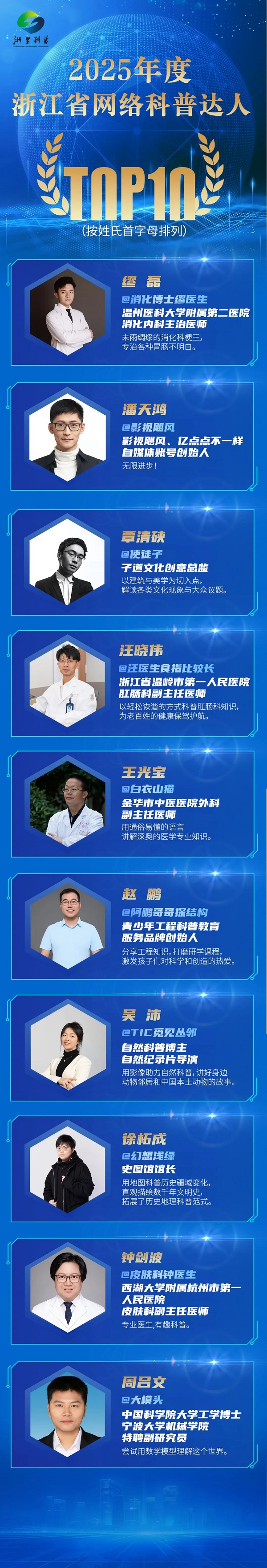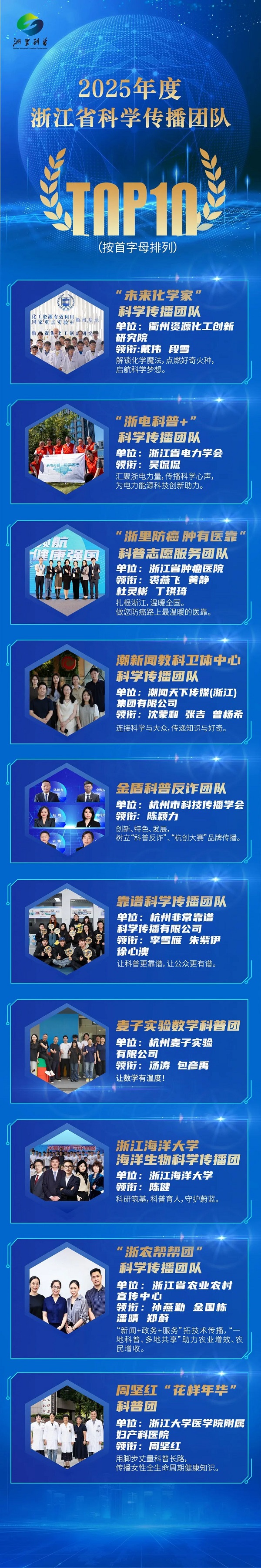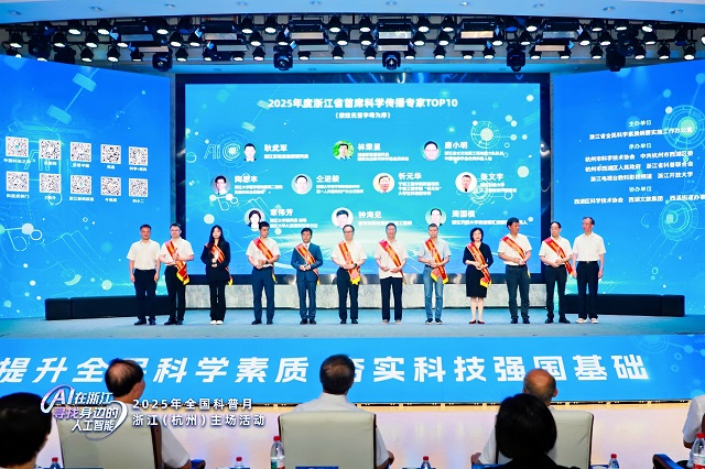 活動(dòng)現(xiàn)場(chǎng)亮點(diǎn)紛呈,備受關(guān)注的2025年浙江省“十百千萬(wàn)”科學(xué)傳播專家名單在現(xiàn)場(chǎng)正式揭曉——2025年度浙江省首席科學(xué)傳播專家TOP10、2025年度浙江省科學(xué)傳播團(tuán)隊(duì)TOP10與2025年度浙江省網(wǎng)絡(luò)科普達(dá)人TOP10名單,逐一亮相。入選者包含破解技術(shù)密碼的首席專家、打造爆款科普產(chǎn)品的創(chuàng)意團(tuán)隊(duì)、吸引千萬(wàn)網(wǎng)友愛(ài)上科學(xué)的網(wǎng)絡(luò)科普達(dá)人……這些優(yōu)秀個(gè)體與團(tuán)隊(duì)的涌現(xiàn),彰顯出浙江在科學(xué)傳播領(lǐng)域的強(qiáng)勁實(shí)力。