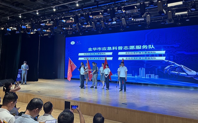 金華市科協(xié)黨組書記、主席施怡偉為社區(qū)應急科普志愿服務隊、農村應急科普志愿服務隊、校園應急科普志愿服務隊、企業(yè)應急科普志愿服務隊等4支應急科普志愿服務隊授旗。