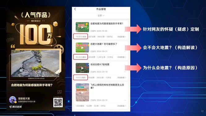 第一篇從地質(zhì)構(gòu)造角度,解讀該區(qū)域?yàn)楹螘l(fā)生地震;第二篇從構(gòu)造特征與歷史數(shù)據(jù)出發(fā),分析后續(xù)發(fā)生強(qiáng)震的概率為何較低;第三篇是針對網(wǎng)絡(luò)熱議話題——“震感這么強(qiáng),是不是地震局改了震級?”——專門澄清誤解,解釋震感與震級、震源深度、地質(zhì)條件的關(guān)系。這三支視頻發(fā)布后,傳播效果良好,評論區(qū)反饋積極。尤其是第三條,直接回應(yīng)了公眾疑慮,起到了“止謠于未起”的作用。