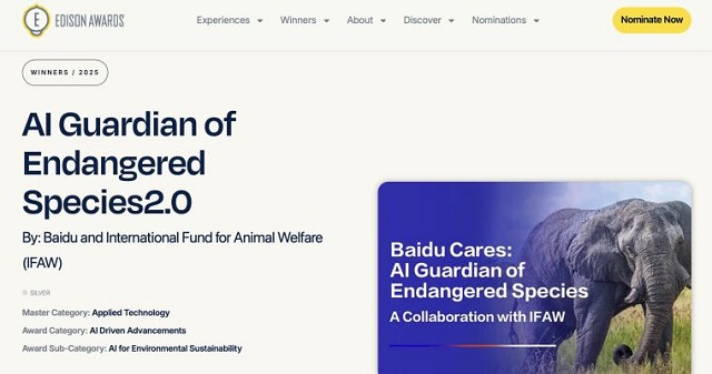 當?shù)貢r間10月16日,第25屆愛護動物行動獎(Animal Action Award)活動現(xiàn)場,百度憑借“瀕危物種AI守護官2.0”項目獲得年度創(chuàng)新實踐獎(Innovator of the Year Award)。該獎項用于表彰在動物保護和福利領(lǐng)域,通過創(chuàng)新技術(shù)和解決方案取得卓越成效的先鋒行動者。