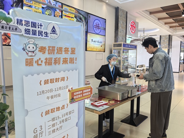 考試期間恰逢冬至,為了讓考生感受到“家”一般的溫暖,學(xué)校特意準(zhǔn)備了一份小驚喜:后勤服務(wù)中心在餐廳開(kāi)設(shè)助考專窗,考生憑準(zhǔn)考證即可免費(fèi)領(lǐng)取一份湯圓或水餃。這讓浙江財(cái)經(jīng)大學(xué)張同學(xué)倍感暖心:“味道很好,六顆湯圓還寓示著‘六六大順’,學(xué)校的這份用心我接收到了。”