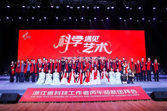 1月7日,“科學咖啡館”特別活動之“科學遇見藝術”浙江省科技工作者丙午迎新團拜會在杭舉行,兩院院士潘云鶴、蘇紀、楊華勇、徐世烺、喻景權、李琳、李爾平、唐納德·布魯斯·丁威爾蘭,浙江省科協(xié)黨組書記、副主席沈敏等參加。