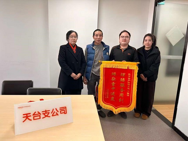 1月15日,褚先生在家人陪同下專程來到平安產(chǎn)險天臺支公司門店,向查勘員楊日斌、門店工作人員許敏華送上錦旗,對二人專業(yè)高效、貼心周到的服務(wù)表達高度認(rèn)可與誠摯謝意,也充分彰顯了平安產(chǎn)險天臺支公司“以客戶為中心”的服務(wù)理念。