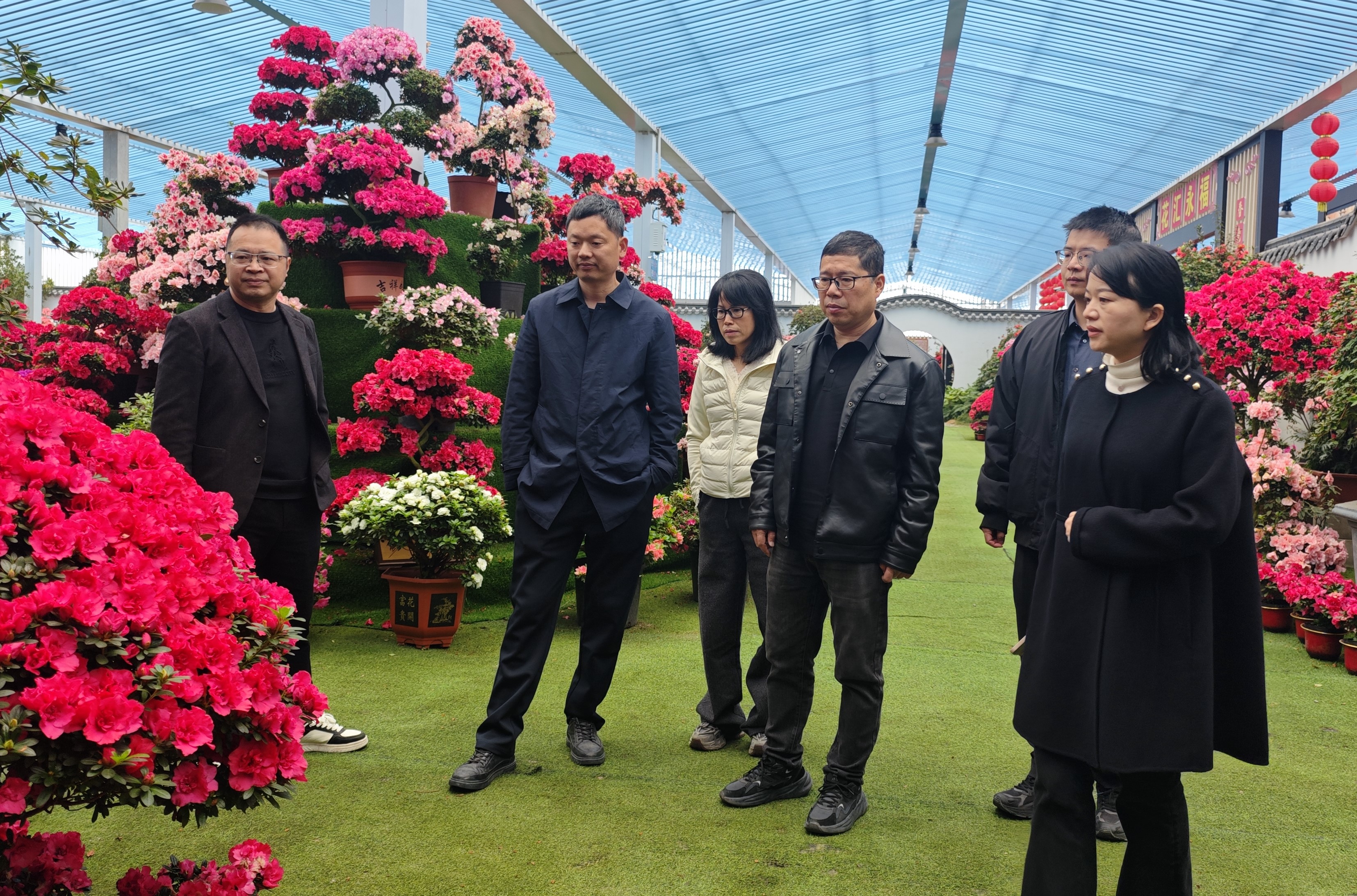 在永福花卉中心,調(diào)研組詳細(xì)了解了杜鵑花期調(diào)控、造型盆景培育、品種創(chuàng)新等核心技術(shù),蔡志勇工程師現(xiàn)場講解了當(dāng)?shù)毓タ嗽O(shè)施栽培、基質(zhì)選擇等技術(shù)難題的過程,以及科技如何推動(dòng)杜鵑產(chǎn)業(yè)從傳統(tǒng)盆栽向精致化、藝術(shù)化升級(jí),為東溪鄉(xiāng)櫻花品種篩選、茶園景觀打造提供了重要借鑒。
