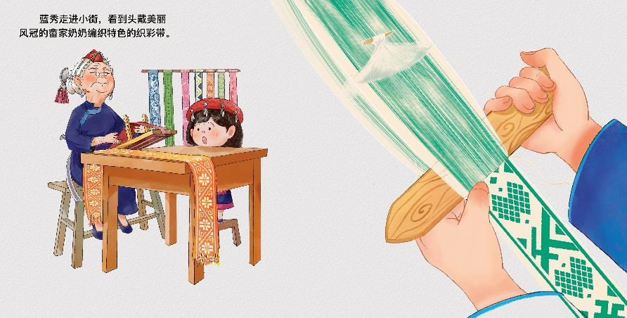 為了打破傳統(tǒng)繪本的靜態(tài)邊界,創(chuàng)作團(tuán)隊(duì)將手繪藝術(shù)與前沿?cái)?shù)字技術(shù)深度融合。他們先用Procreate軟件進(jìn)行手繪,嚴(yán)格遵循畬族傳統(tǒng)美學(xué),以青、藍(lán)、紅、白四色為基調(diào):淡墨綠詮釋畬鄉(xiāng)山林,靛染藍(lán)彰顯民族工藝,朱紅與明黃撞色烘托節(jié)慶氛圍,水彩白勾勒山居生活。每一個(gè)角色的設(shè)計(jì)也頗具匠心,主人公藍(lán)秀活潑好奇,易于引發(fā)年輕讀者共鳴;而織彩帶的阿婆、遞茶的畬鄉(xiāng)孩童等配角,其服飾與造型均嚴(yán)格考證,讓民族特色躍然屏上。